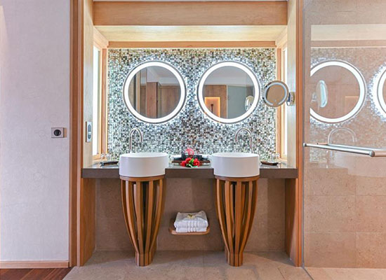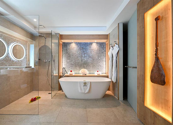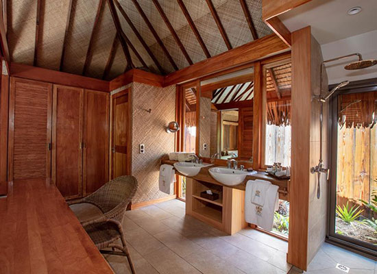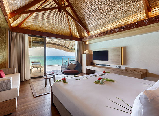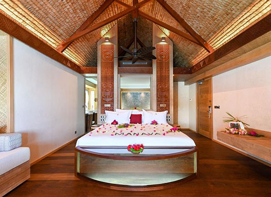 Each bungalow features a spacious bedroom area, complete with an en-suite bathroom that includes a bathtub and separate shower. Guests can also enjoy a furnished sundeck with a gazebo and direct access to the lagoon. An opening glass panel located at the end of the bed and next to the bathtub will allow you to look at the lagoon under your bungalow and give you access to feed the passing fish.