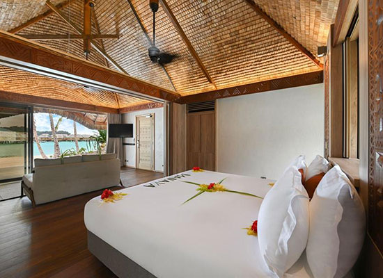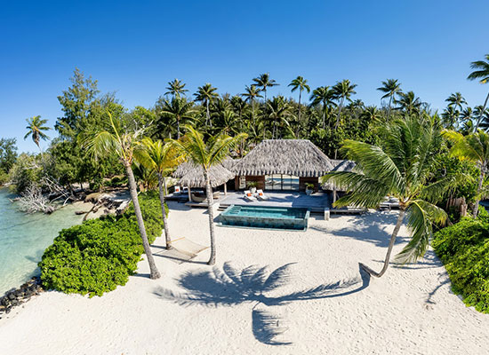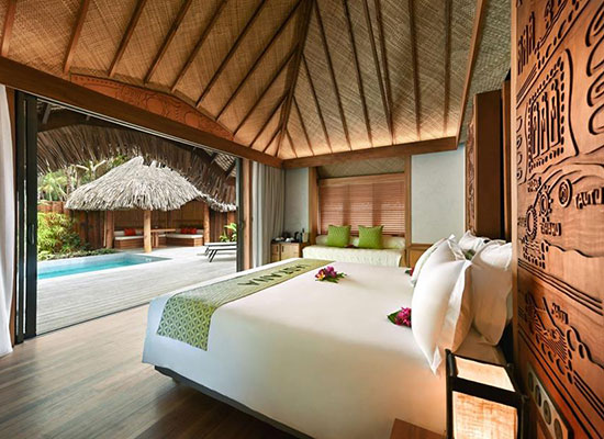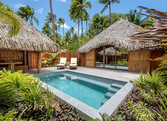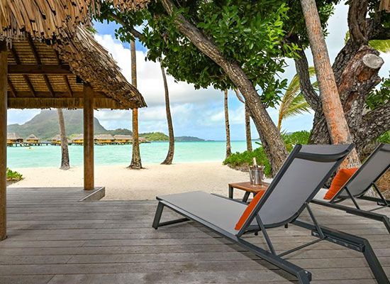 These villas include a large bedroom area, a comfortable living room that opens onto the beach with breathtaking views of the lagoon and Mt. Otemanu. In addition, they are equipped with a private plunge pool and a beautiful garden space.