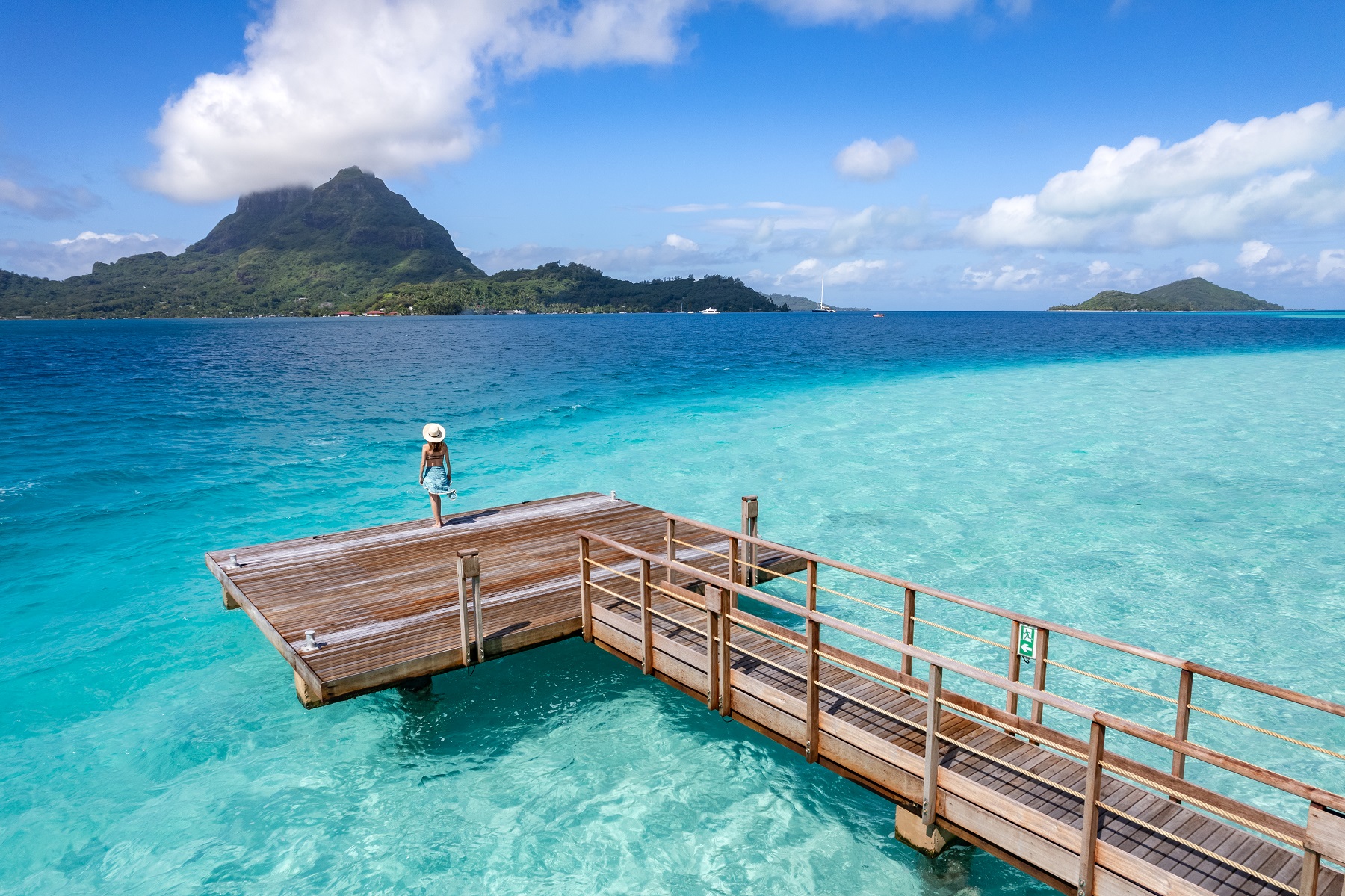 Towards the end of the pontoon and poised over the beautiful crystal clear water of the Bora Bora Lagoon, with views of the majestic Mount Otemanu.