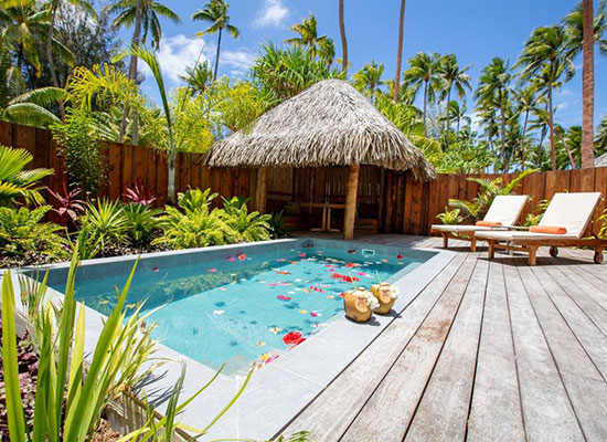This villa was designed as a traditional Polynesian "faré" meaning "home." It is surrounded by its own private garden, features a spacious bedroom area with a king sized bed, and an en-suite bathroom with a minibar. In the garden of the villa there is a large sundeck with a plunge pool, and a gazebo perfect for lounging and relaxing!