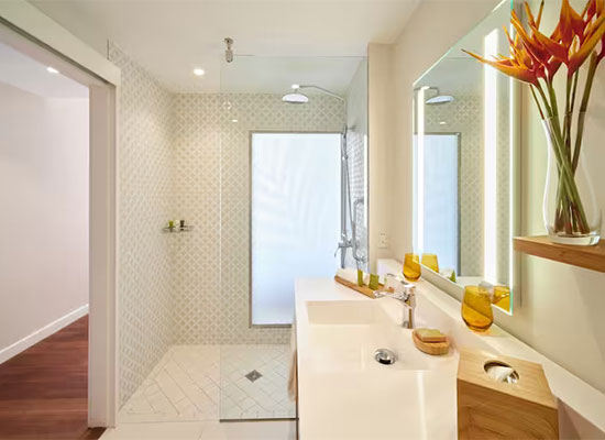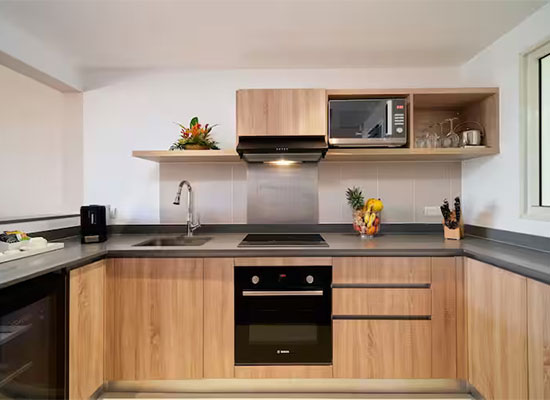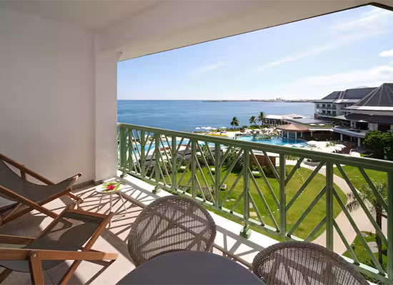 The two-bedroom ocean suite offers two king beds, making it ideal for families of up to five adults. It also includes a separate living room with a full kitchen, two bathrooms, and a private balcony with a stunning view of the ocean. Additionally the suite features air conditioning, black-out curtains, evening room service, a flexible work environment, a hairdryer, an espresso machine, a full kitchen, a microwave, and a minibar.