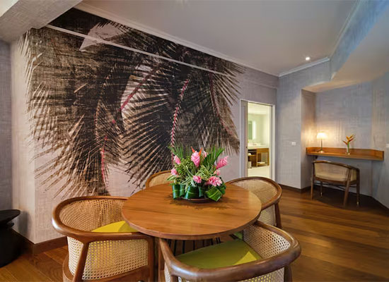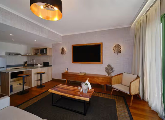 The Residence Suite offers several amenities, including a separate living room, a walk-in closet, a kitchenette, and a private balcony with a view of the garden. It can sleep up to three adults and one child (12 years and below) and additionally features air conditioning, black-out curtains, evening room service, a flexible work environment, a hairdryer, an espresso machine, an iron, an ironing board, a microwave, a minibar, and a mini refrigerator.
